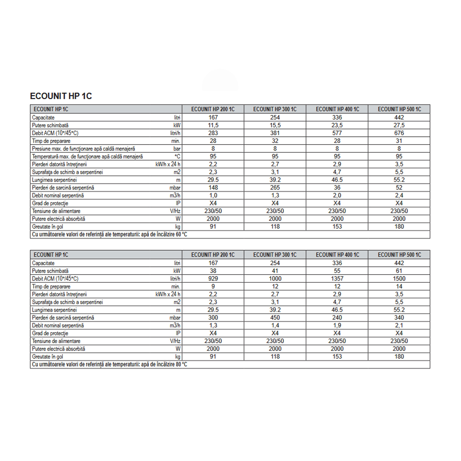 Specificatii tehnice pe variante – Ferroli Ecounit HP 1C