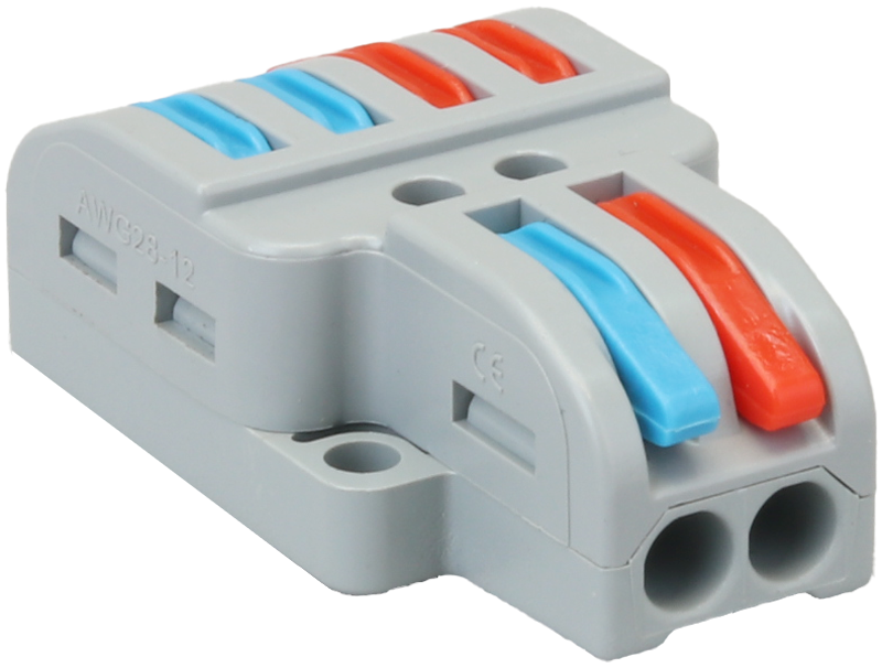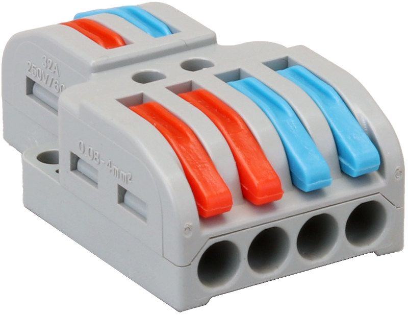 Clema de legaturi fara surub, compatibila cu conductori intre 0.5 si 4 mm² si tensiune nominala 400V. Sistem profesional de conectare tip spring clamp ce asigura presiune constanta, contact electric sigur si montaj rapid fara retensionare. Recomandata pentru tablouri electrice, distributie circuite si aplicatii rezidentiale sau industriale.