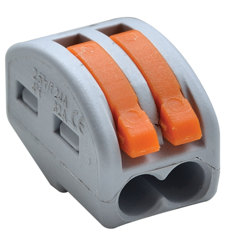 Clema de legaturi fara surub cu 2 poli, compatibila cu conductori intre 0.75 si 4 mm² si tensiune nominala 400V. Sistem profesional de conectare tip spring clamp ce asigura presiune constanta, contact electric stabil si montaj rapid fara retensionare. Ideala pentru tablouri electrice, distributie circuite si instalatii rezidentiale sau industriale.