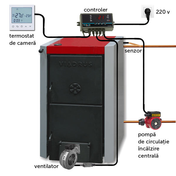 Acest controler este compatibil cu majoritatea centralelor pe lemne: Viadrus, Kenda, Termax, Burnit, Fornello, Ferroli, Termofarc etc.