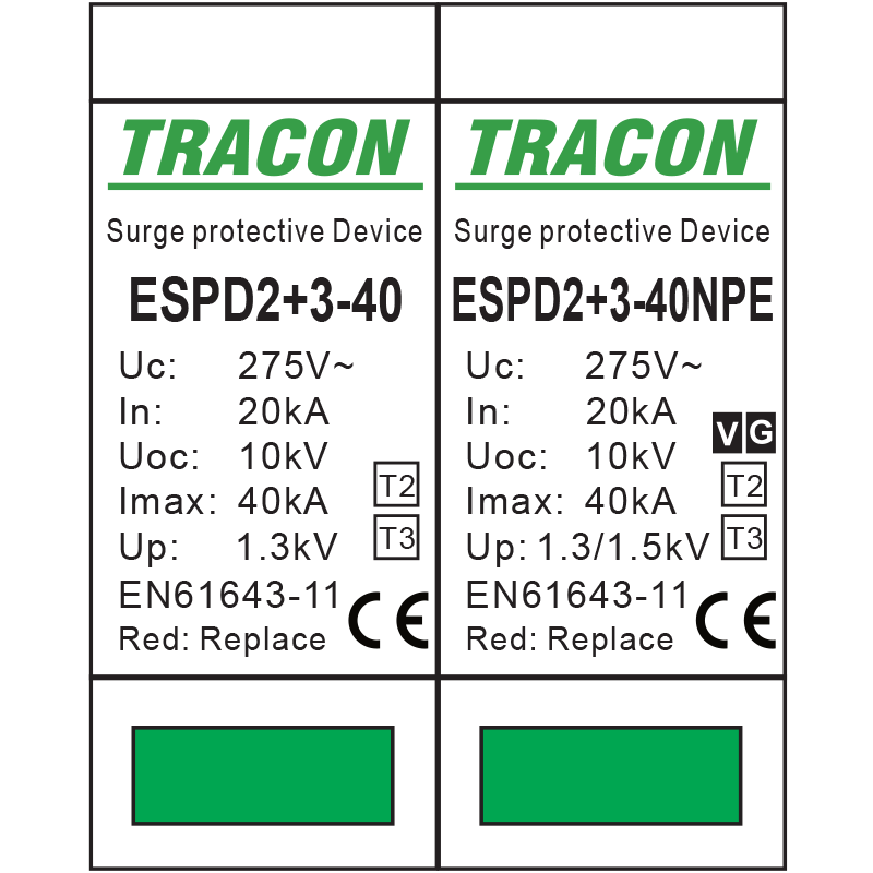 Catalog Descarcator de supratensiune T2+T3 integrat AC 3+1P 40kA 400V - Tracon ESPD2+3-40-3+1P