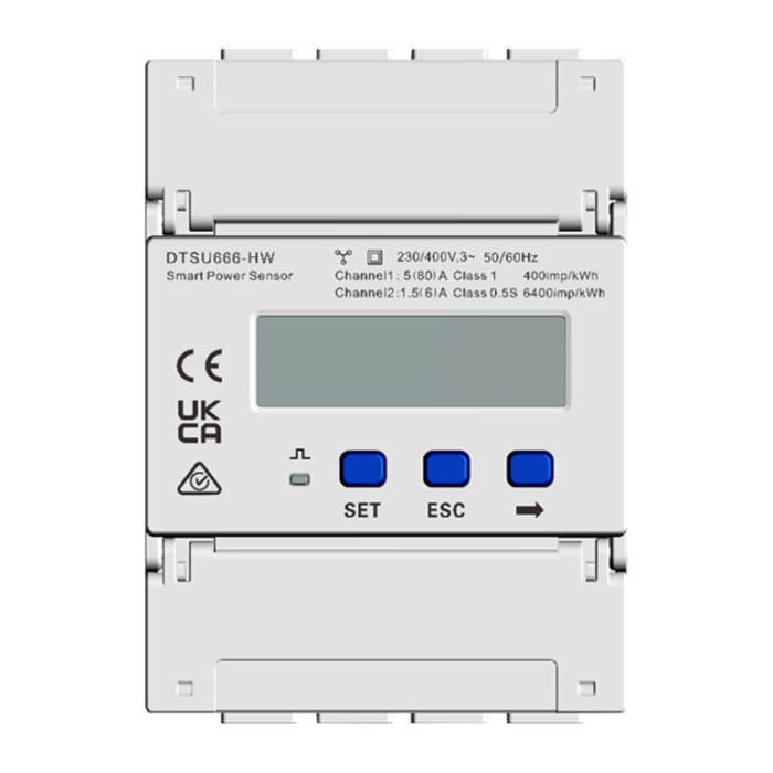 Huawei DTSU-HW (DTSU666-HW / YDS60-80) este un smart meter trifazat folosit in sisteme fotovoltaice pentru masurarea bidirectionala a energiei (import/export) si pentru monitorizarea consumului. Prin comunicatie RS485 Modbus transmite invertorului informatia despre fluxul de energie, fiind utilizat frecvent pentru optimizarea autoconsumului si pentru functii precum limitarea injectiei in retea (zero export), in functie de configuratia sistemului.