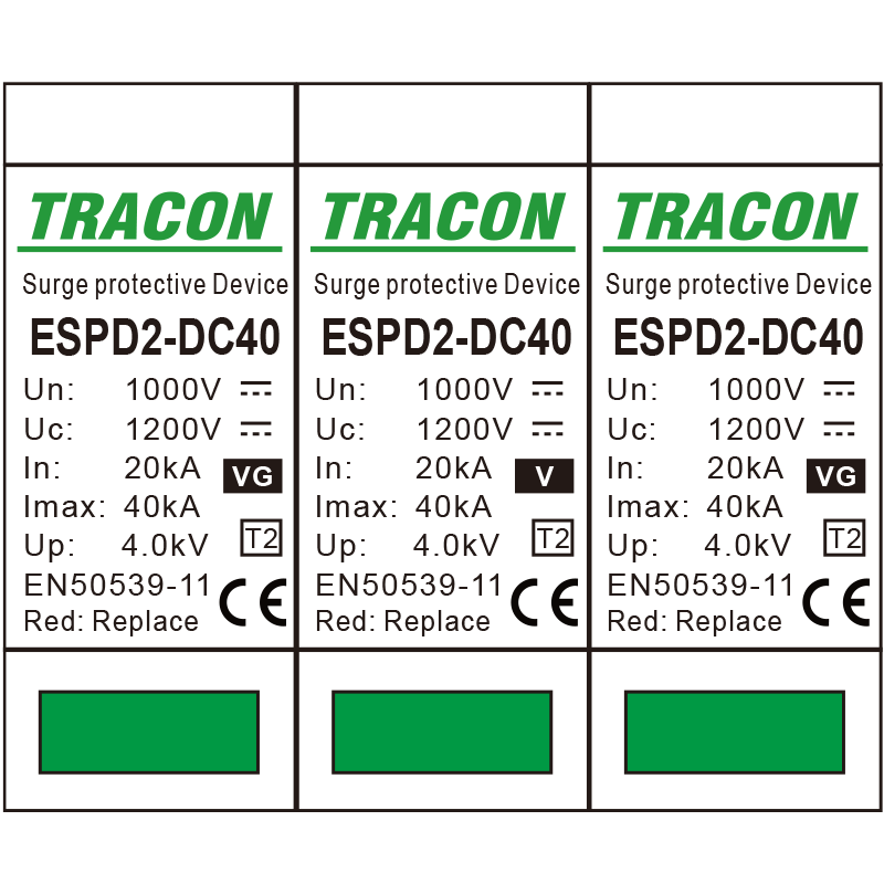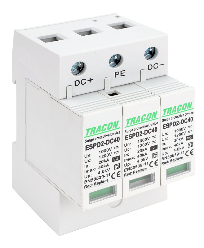 Catalog Descarcator de supratensiune T2 DC Ucpv 1200V 40kA 2P, element modular inlocuibil - Tracon ESPD2-DC40-1000
