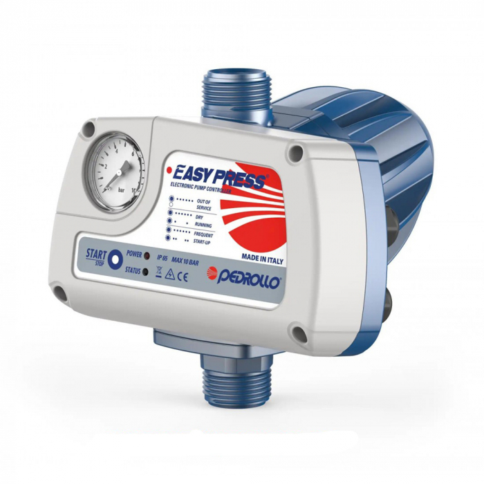 EASYPRESS este un dispozitiv electronic durabil și fiabil, conceput pentru a controla și proteja pompele monofazate de apa menajera cu puteri de pâna la 2 CP. Cu ajutorul unui senzor de presiune și al unui senzor de debit, EASYPRESS activeaza automat pompa atunci când deschiderea unui robinet scade presiunea sub nivelul prestabilit și o dezactiveaza când debitul scade sub 2 l/min sau se oprește complet.