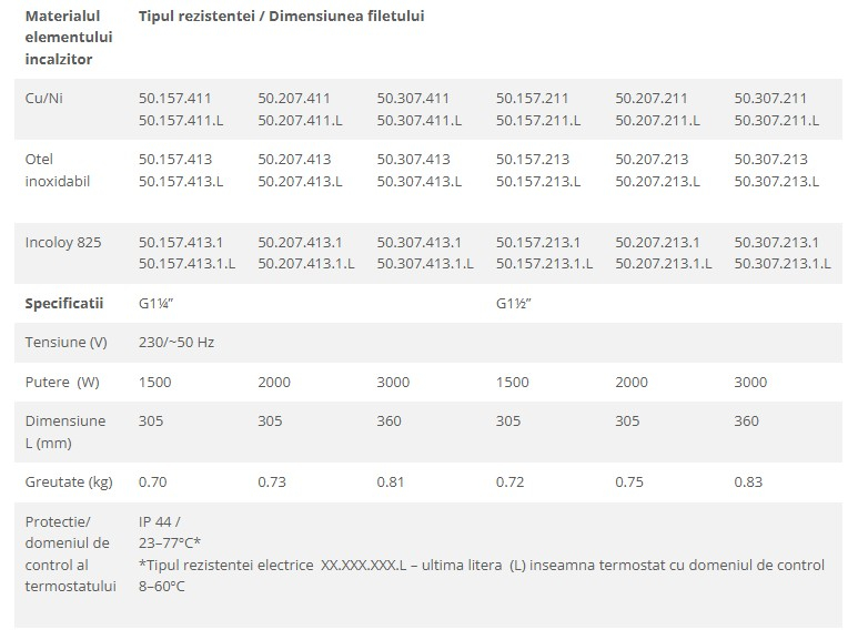 Controlul / setarea termostatului si ledurile ce indica functionarea sunt situate in partea din fata .In partea de jos a termostatului gasim elementul incalzitor , ce are filet de 1¼” sau 1½” Specificatiile rezistentei electrice le gasiti in tabelul de mai jos respectiv in figura alaturata: