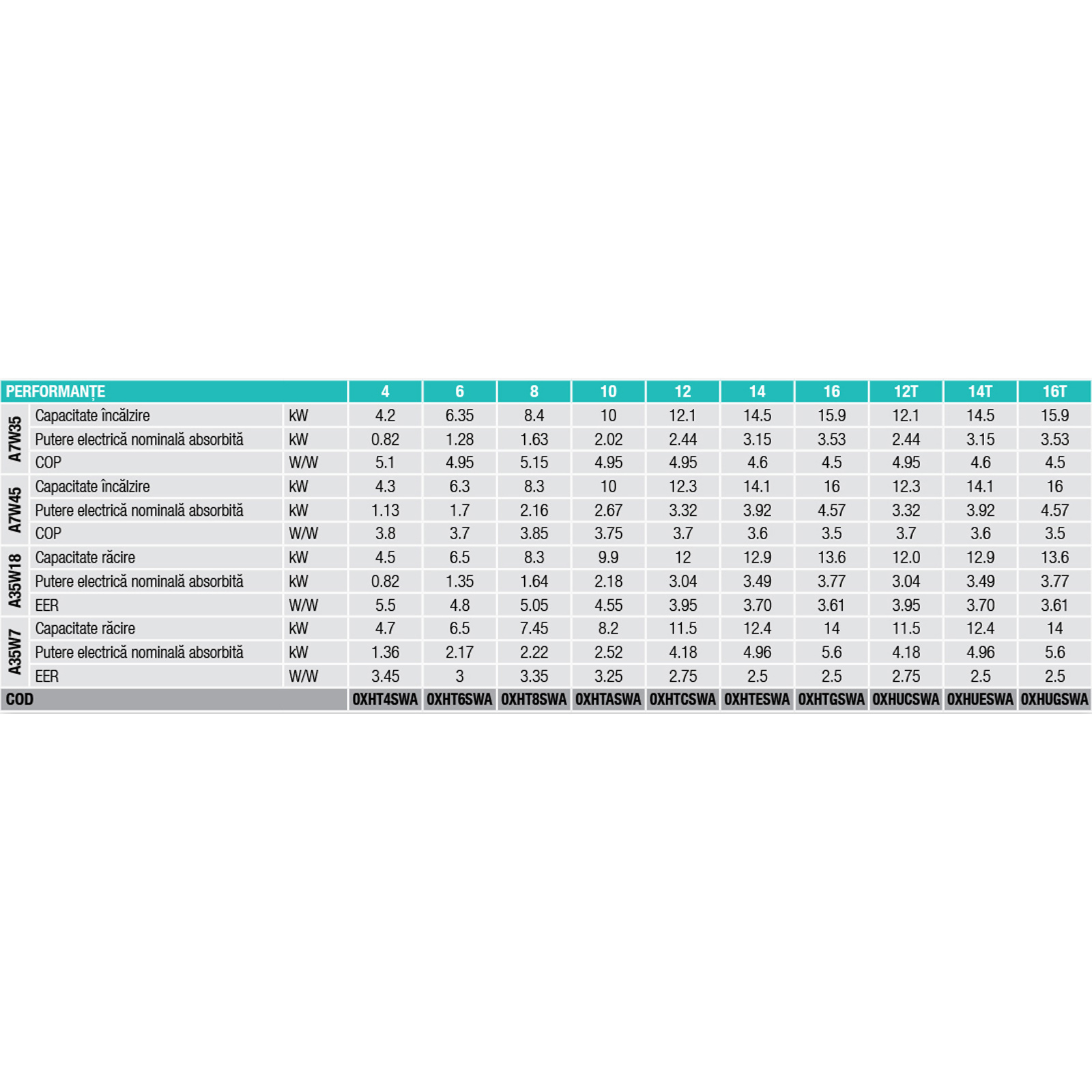 | Capacitate incalzire (A7/W35) | 4.2 kW | 6.35 kW | 8.4 kW | 10 kW | 12.1 kW | 14.5 kW | 15.9 kW |