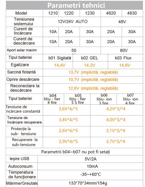 Faptul că acest model este compatibil cu sisteme de 12V și 24V îl face potrivit pentru aplicații unde se utilizează una dintre aceste configurații. Acest lucru oferă flexibilitate în alegerea sistemului și în integrarea regulatorului în proiect.