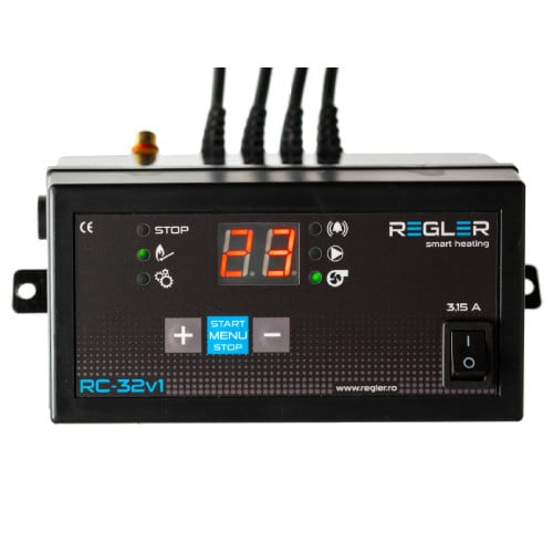 Controlerul REGLER RC-32v1 este un dispozitiv avansat pentru controlul procesului de ardere în centralele pe lemne. Acesta gestionează pompa de încălzire centrală (IC) și ventilatorul, cu opțiunea de conectare a unui termostat de cameră sau a unui senzor de gaze arse, pentru o eficiență termică optimă.