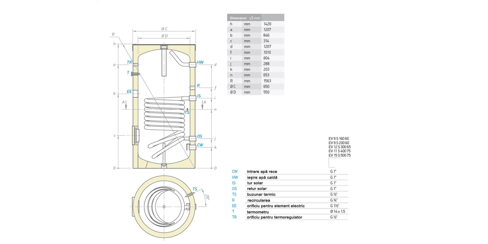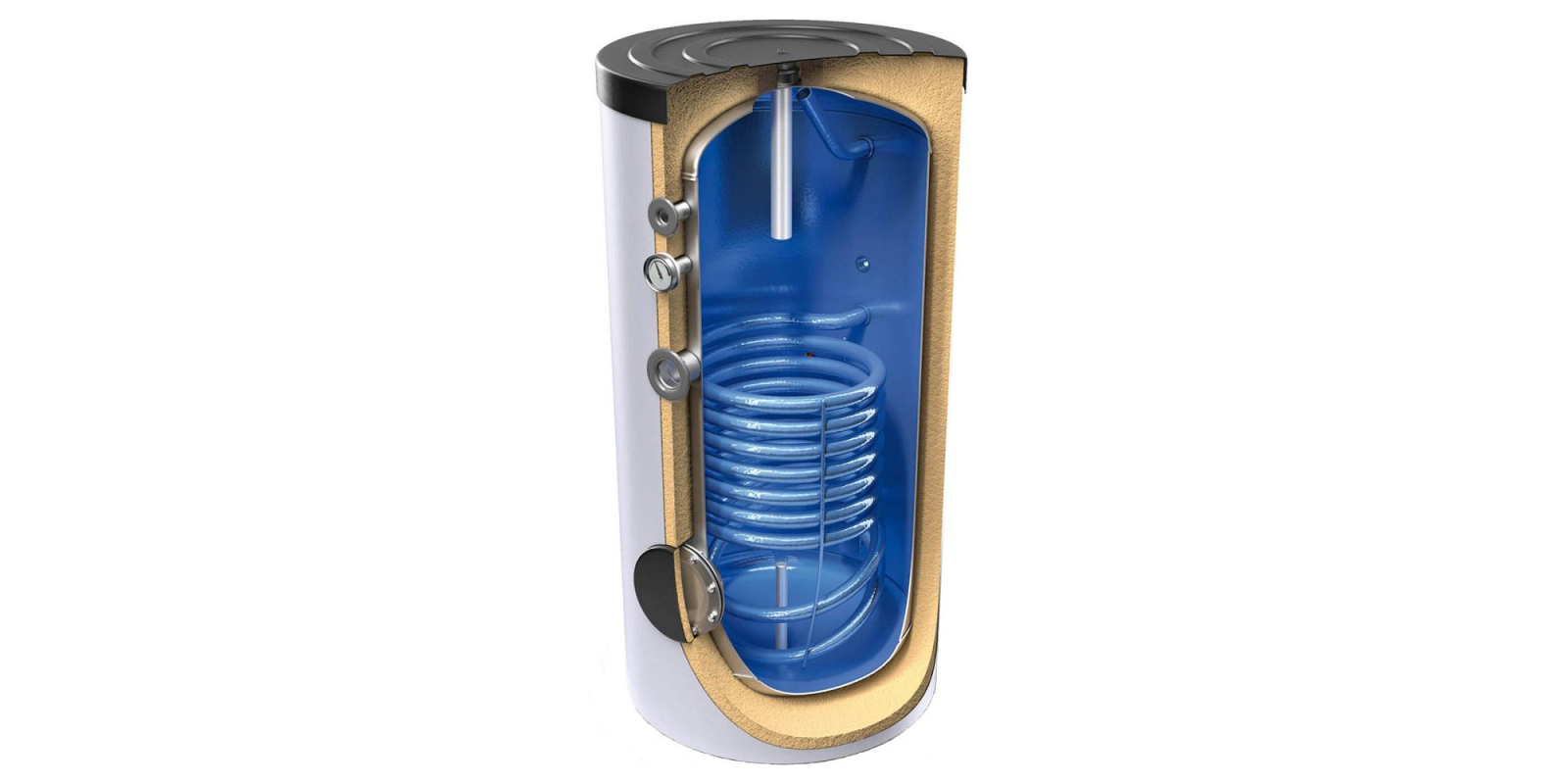 Boilerele indirecte cu 1 serpentină, 300 litri, montaj pe pardoseala, izolat, EV 12S 300 65, Tesy cu montaj pe pardoseală pentru apă caldă menajeră, cu o singură schimbător de căldură, cu colector intern cu capacitate mare, sunt potrivite pentru conectarea la 1 sursă de energie termică, de exemplu sisteme solare, pompe de căldură sau centrală termică în condensație.